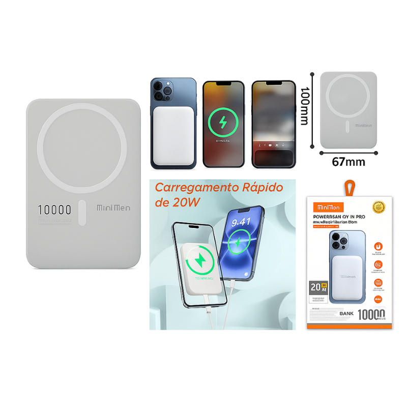 Carregador Portátil MagSafe Sem Fio 10.000mah 20W Turbo Carregamento Magnetico Minimen – MM-CDB300