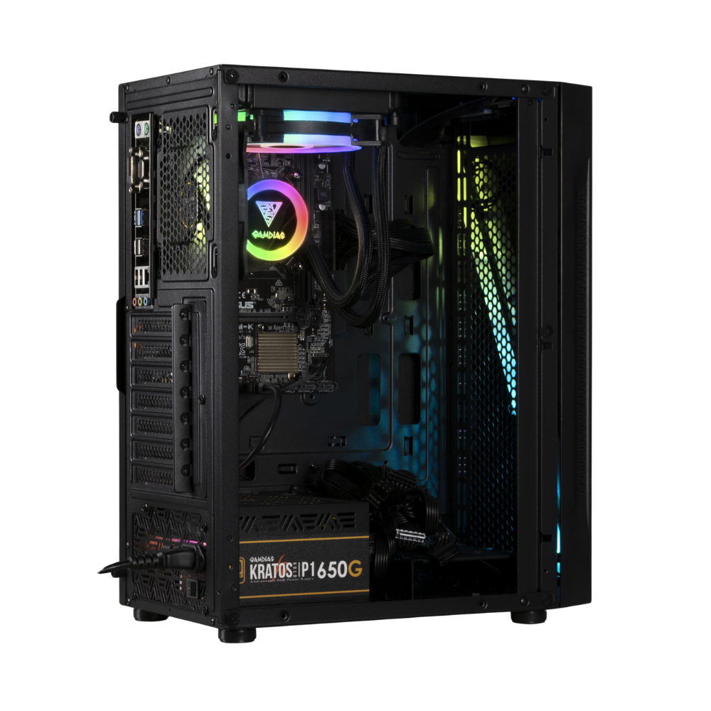 O ARGUS E5 é um elegante gabinete torre média com luz de streaming RGB diagonal com brilho vibrante abaixo do painel e um painel lateral panorâmico de vidro temperado.