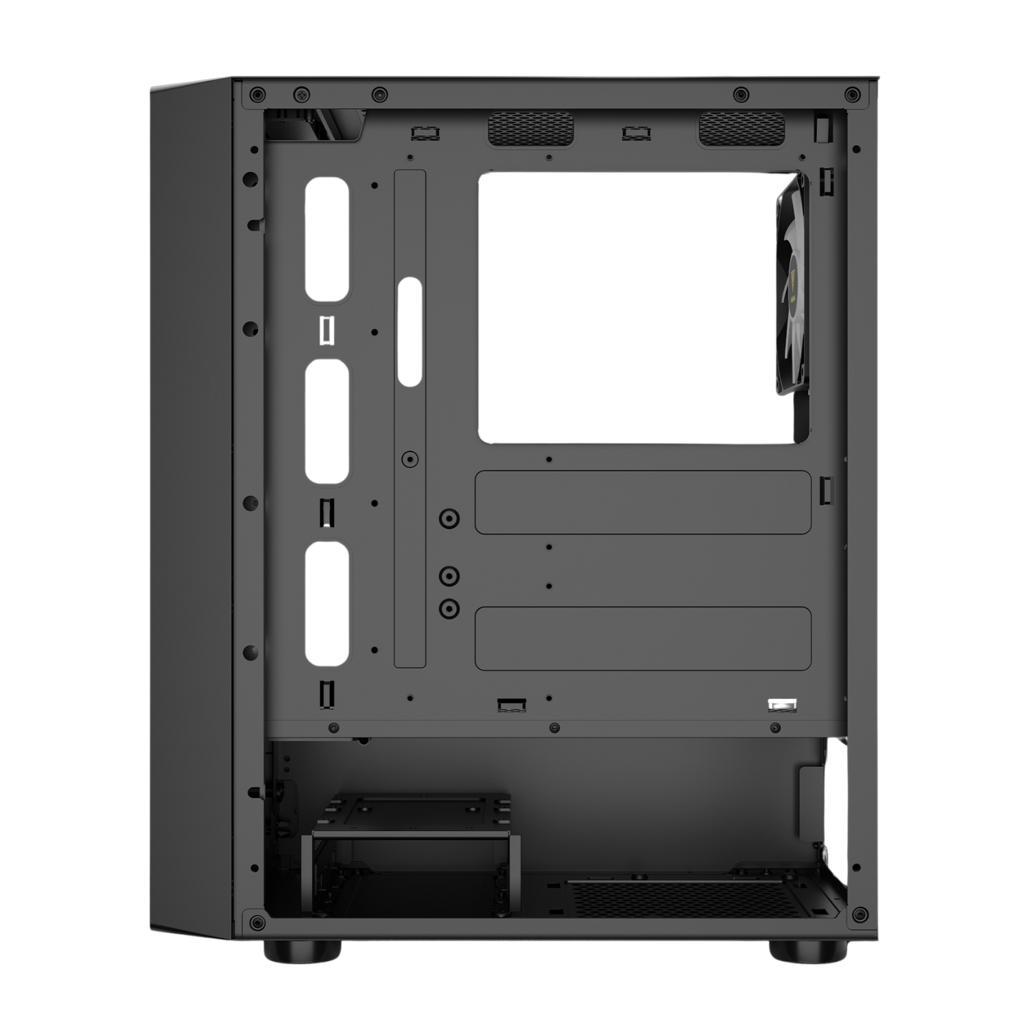 Para garantir uma ventilação eficiente, o Aura GC4 inclui três ventiladores RGB de 120 mm pré-instalados na parte frontal e traseira, adicionando um toque de estilo ao seu setup de jogo. Além disso, possui suporte para mais ventiladores, com opções de montagem na parte superior e frontal do gabinete.