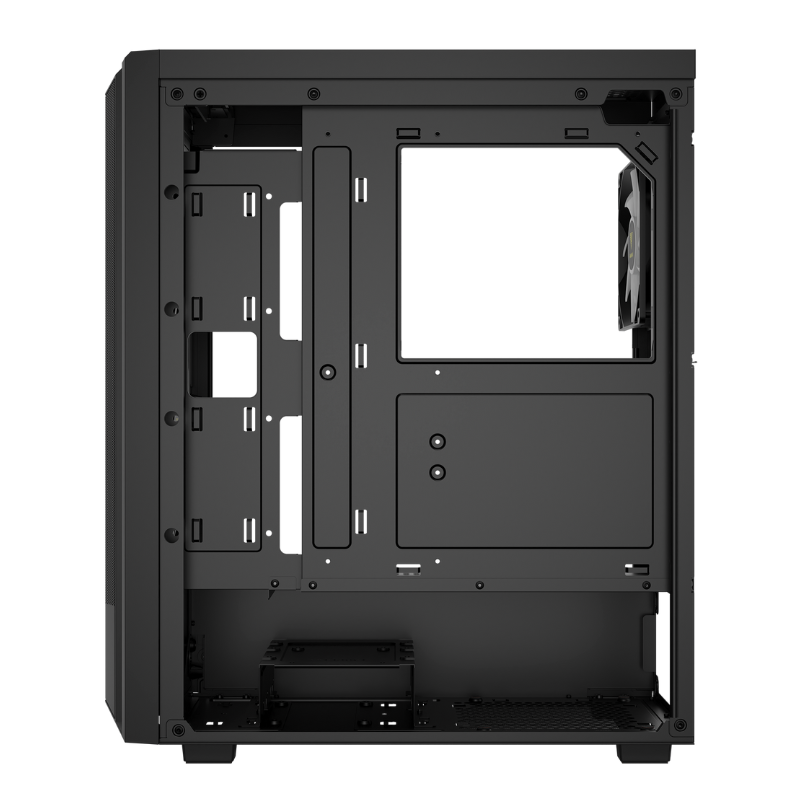 Com amplo espaço interno, o gabinete suporta coolers de CPU com até 160mm de altura e placas de vídeo com até 300mm de comprimento, permitindo a instalação de componentes robustos e potentes. Além disso, o design interno e o gerenciamento de cabos facilitam a organização, proporcionando um visual limpo e um ambiente interno bem ventilado, ideal para setups gamers ou de alto desempenho.