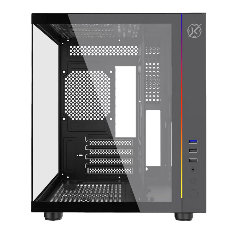 O Gabinete Gamer Kalkan Midgard RGB foi desenvolvido para quem busca estilo, funcionalidade e praticidade em um design compacto. Com classe de tamanho Aquário Micro-ATX, ele combina materiais de qualidade como aço resistente e vidro temperado, garantindo durabilidade e um visual moderno. Sua cor preta, junto com a fita de LED RGB integrada ao painel frontal, adiciona personalidade e brilho ao setup, destacando-se em qualquer ambiente gamer.