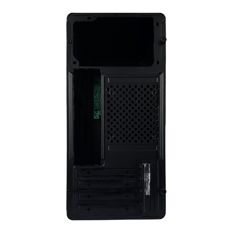 O painel frontal é equipado com duas portas USB 2.0 e conexões de áudio, facilitando o acesso rápido a dispositivos e periféricos essenciais. Além disso, o gabinete possui quatro slots PCI disponíveis, permitindo expansões adicionais conforme a necessidade do usuário.
