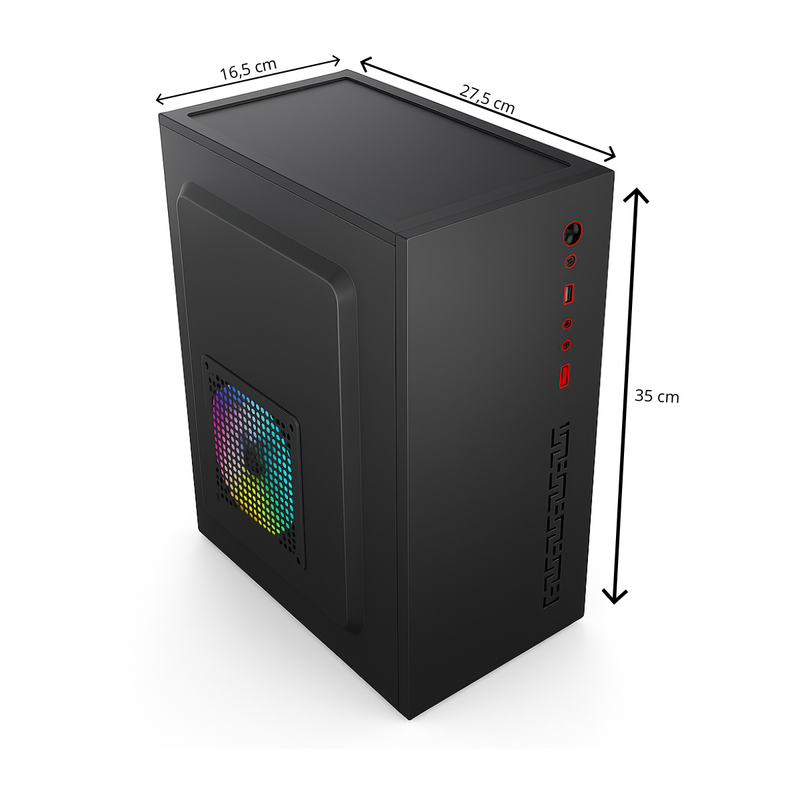 Com um painel frontal prático, o gabinete possui duas portas USB 2.0 que facilitam a conexão de seus periféricos, como teclado, mouse ou pendrives. O chassi é otimizado para a instalação de uma fonte de alimentação padrão ATX (não inclusa), garantindo flexibilidade na escolha dos seus componentes.