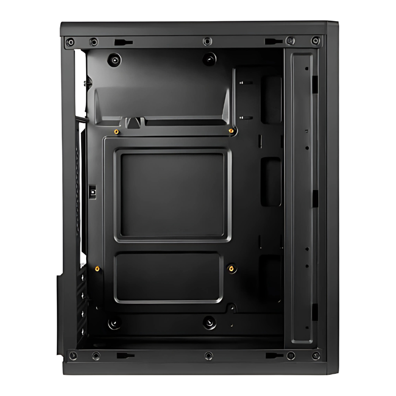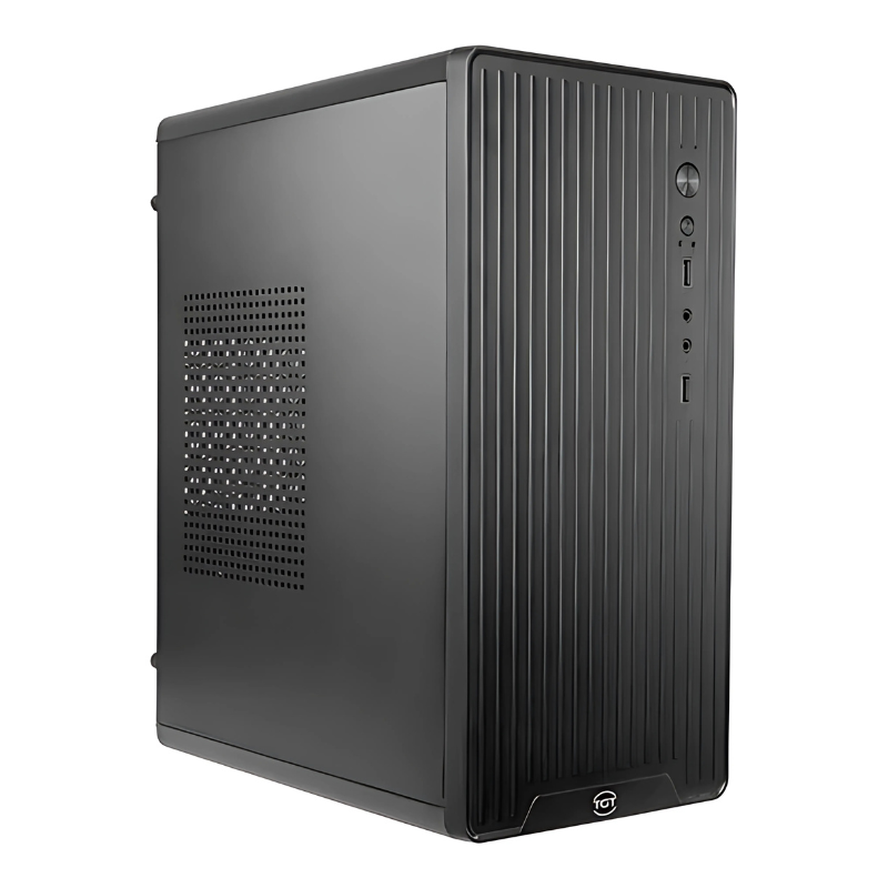 O painel frontal conta com conexões essenciais para o dia a dia, incluindo duas portas USB 2.0 e entradas de áudio, facilitando o acesso rápido a dispositivos externos e fones de ouvido. Por ser um gabinete voltado para o uso corporativo ou básico, não há suporte para sistemas de refrigeração líquida, o que reforça seu foco em configurações de baixo consumo e fácil manutenção.