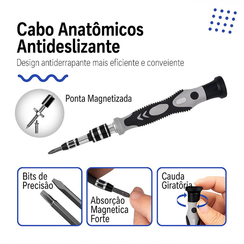 Um dos grandes diferenciais deste kit é o magnetizador/desmagnetizador incluso, que permite ajustar o magnetismo das ponteiras conforme a necessidade, facilitando a manipulação de parafusos pequenos e evitando perdas durante o trabalho. O cabo ergonômico com empunhadura antiderrapante proporciona conforto e controle durante o uso prolongado.