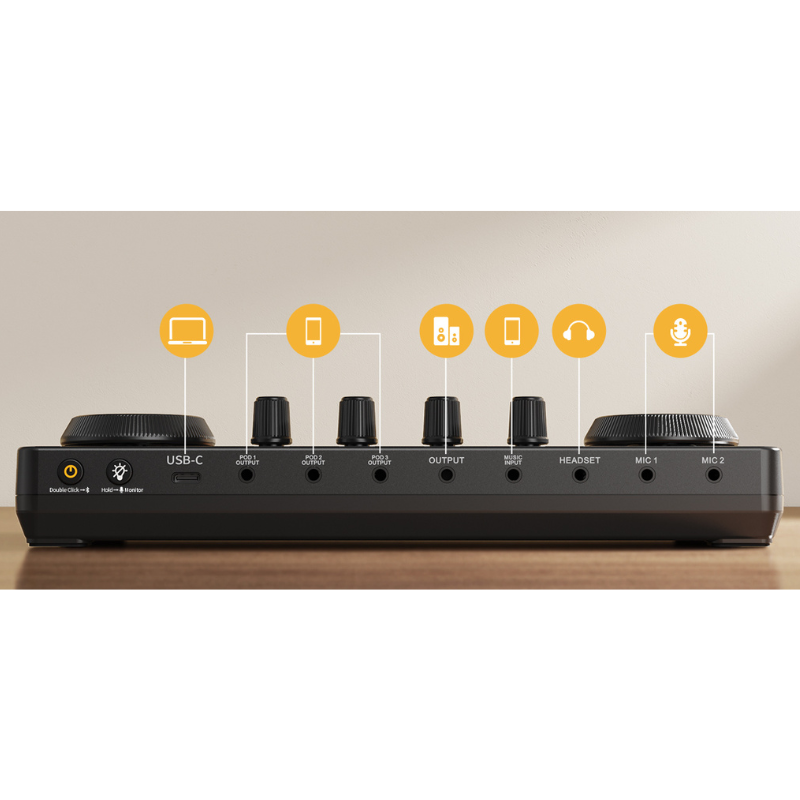 A mesa de som oferece conectividade versátil via USB ou Bluetooth 4.2, ideal para integrar-se facilmente a computadores e dispositivos móveis. Sua resposta de frequência de 20Hz a 20kHz e taxa de amostragem de 48kHz/16bit garantem excelente fidelidade sonora, enquanto a bateria interna de 1200mAh proporciona até 8 horas de uso contínuo. Com botões iluminados, recursos intuitivos e funções dedicadas ao controle de áudio em tempo real, ela é perfeita para transmissões ao vivo e gravações dinâmicas.