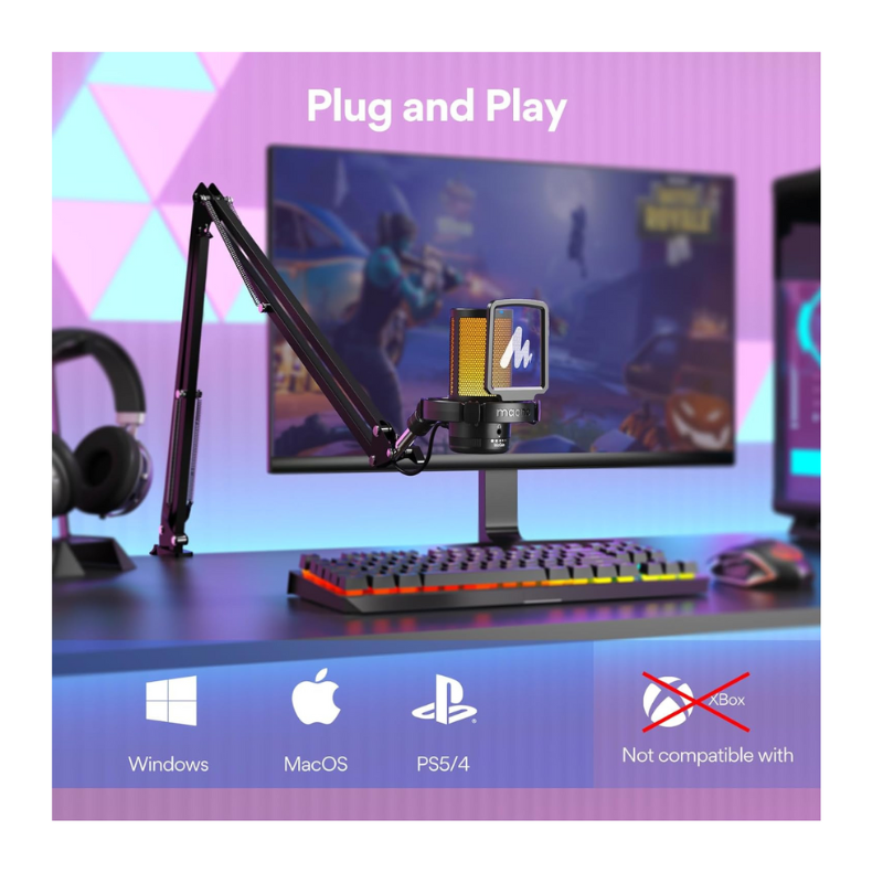 O microfone oferece conectividade versátil com opções de USB-A e USB-C, compatível com uma variedade de dispositivos, incluindo desktops, laptops, computadores, PS4, PS5, MAC OS e Windows. Isso facilita a instalação e o uso em diferentes setups, sem a necessidade de drivers adicionais.