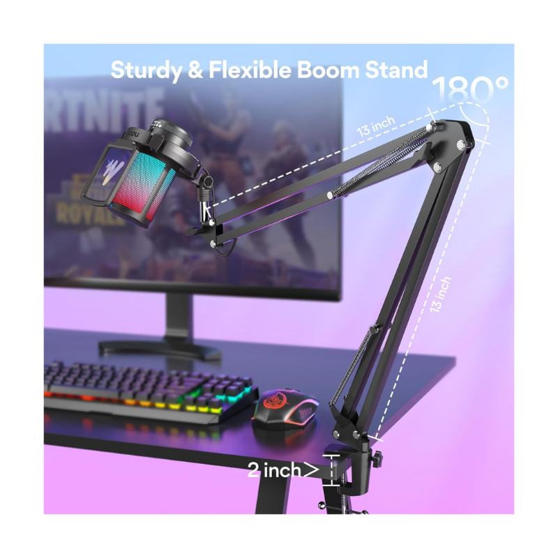Além disso, o Maono DGM20S vem com um suporte de mesa e um braço articulado, proporcionando estabilidade e permitindo ajustes precisos na posição do microfone para maior conforto e ergonomia durante o uso. A iluminação RGB com três efeitos adiciona um toque de estilo ao seu ambiente de gravação, tornando-o não apenas funcional, mas também visualmente atraente.