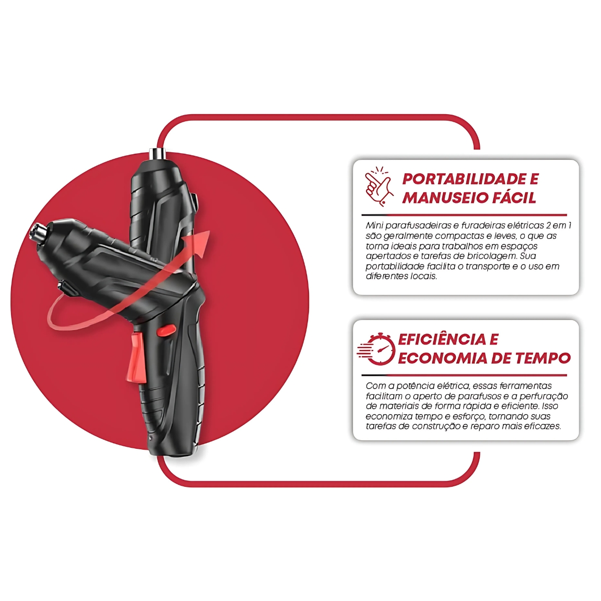 Tenha mais praticidade e eficiência nas tarefas do dia a dia com esta Mini Parafusadeira Elétrica 4.2V. Ideal para pequenos reparos, montagem de móveis, instalações e muito mais, ela conta com luz LED, função reversa, cabo ajustável e carregamento via USB-C.