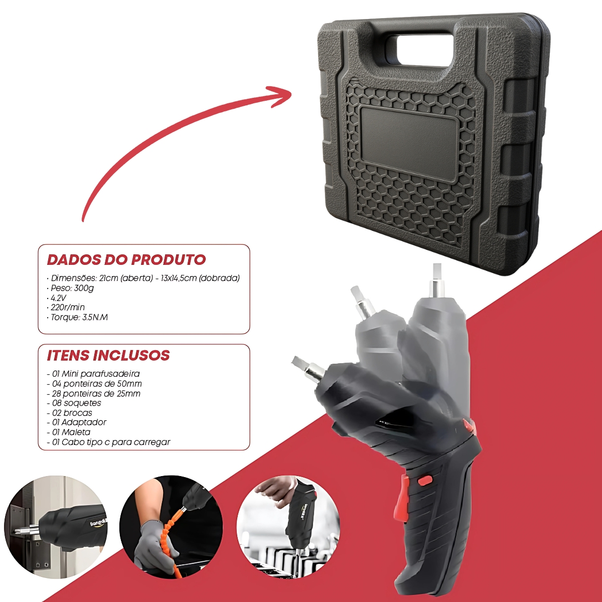 Mini Parafusadeira Elétrica Recarregável 4.2V com LED – Kit 45 Itens + Maleta