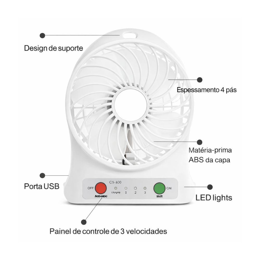 Mini Ventilador Portátil Recarregável Usb Branco 3 Velocidades – MM-H2-BRANCO