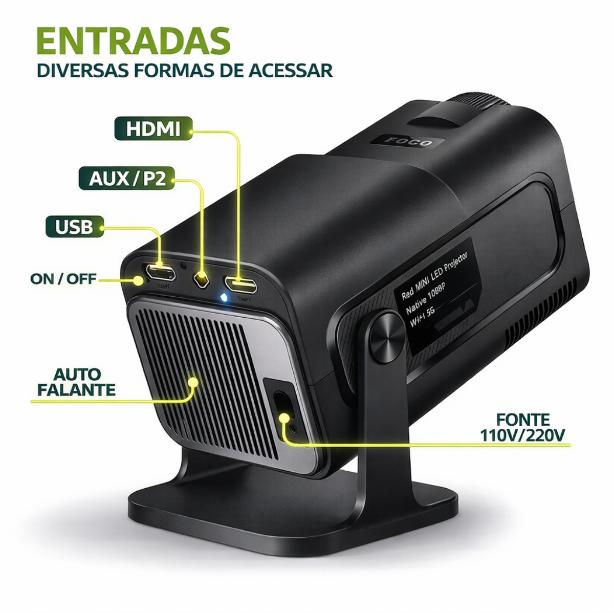 Com suporte a resolução 4K e brilho de 4500 Lumens (160 ANSI), o HY320 Mini entrega imagens vibrantes e nítidas. Sua conectividade de última geração conta com Wi-Fi 6 para streamings sem travamentos e Bluetooth 5.0 para conectar suas caixas de som ou fones de ouvido favoritos. Seu design com suporte ajustável permite projetar em diferentes ângulos com facilidade, ideal para filmes, jogos (input via HDMI) e apresentações.