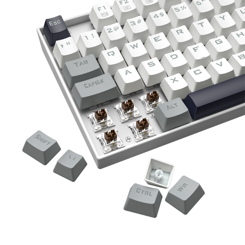 Seu design com teclas flutuantes com borda e keycaps personalizadas nas cores branco, preto e cinza cria uma estética moderna e chamativa. A iluminação RGB individual por tecla pode ser totalmente ajustada via software dedicado, permitindo criar efeitos e configurações que combinam com o seu setup.