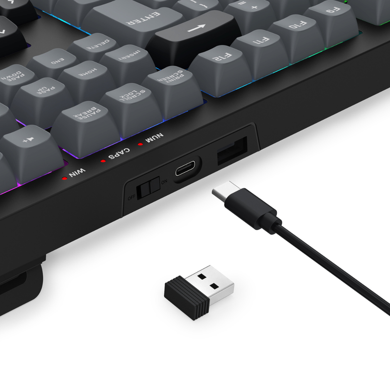 Equipado com tecnologia sem fio, o Crux K518R-WL-GB oferece três modos de conexão: USB Tipo-C, Bluetooth e receptor USB 2.4GHz, garantindo versatilidade e liberdade para diferentes dispositivos e situações. Seu espaço dedicado para armazenamento do receptor facilita o transporte, mantendo o acessório sempre protegido e à mão. A bateria interna de 2000 mAh proporciona longa autonomia, permitindo horas de uso contínuo antes da necessidade de recarga.