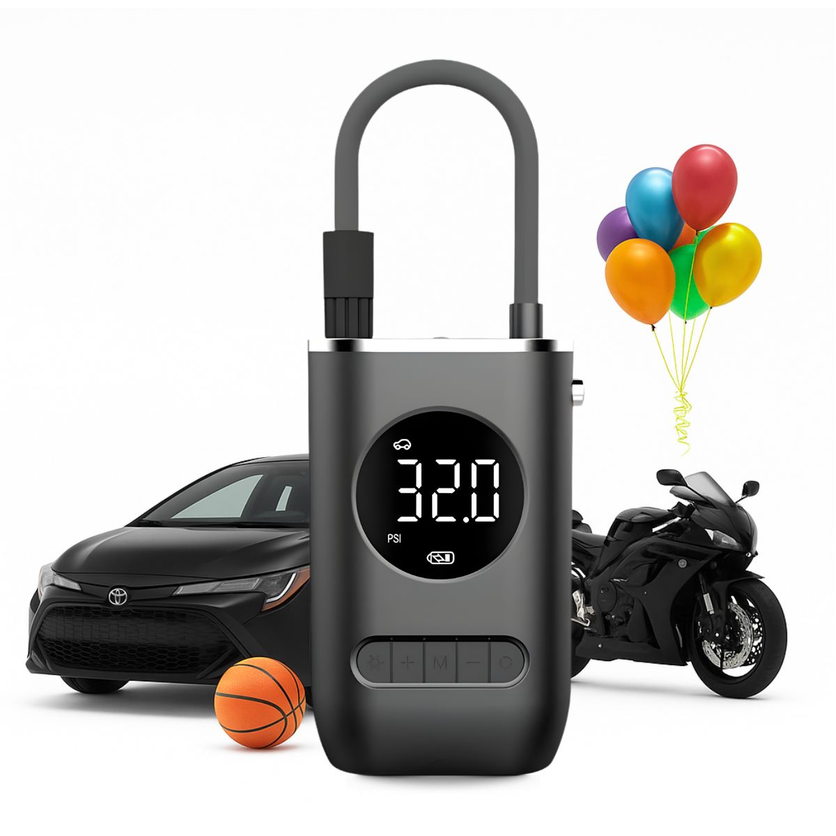 O design inclui 4 modos pré-definidos para diferentes usos (carro, moto, bicicleta e bolas), tornando a operação simples e intuitiva. Além disso, conta com uma lanterna LED integrada para facilitar o uso em situações de pouca luz ou emergências noturnas. Recarregável via USB-C, é a solução moderna e prática para suas necessidades de inflação.
