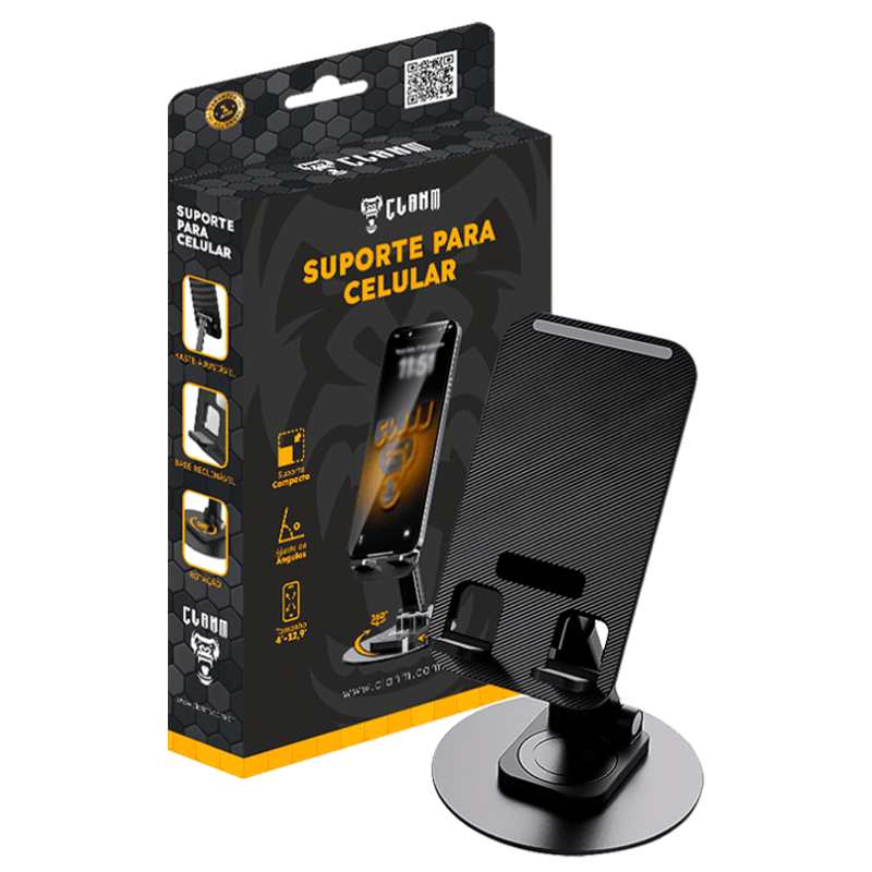 Na cor preta e com design discreto e moderno, o Clanm CS01 se adapta facilmente a qualquer ambiente. Leve e funcional, é compatível com todos os modelos de celulares, oferecendo uma solução simples e eficiente para quem busca conforto e praticidade ao utilizar o celular em superfícies planas.